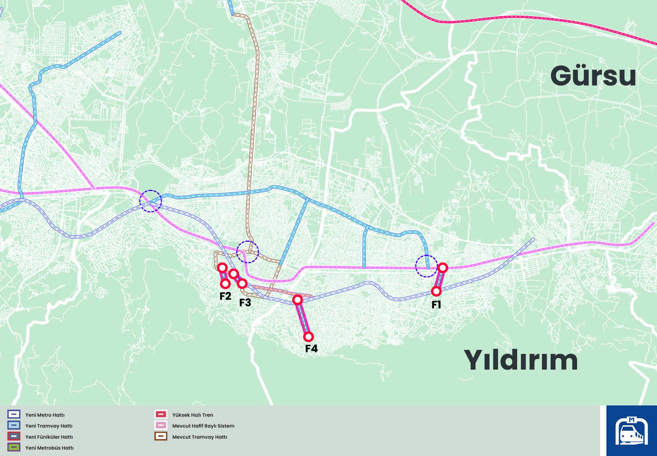 F1 - Arabayatağı, MimarsinanF2 - Altıparmak, Millet HastanesiF3 - Arap Şükrü, TophaneF4 - Emirsultan, Teleferik