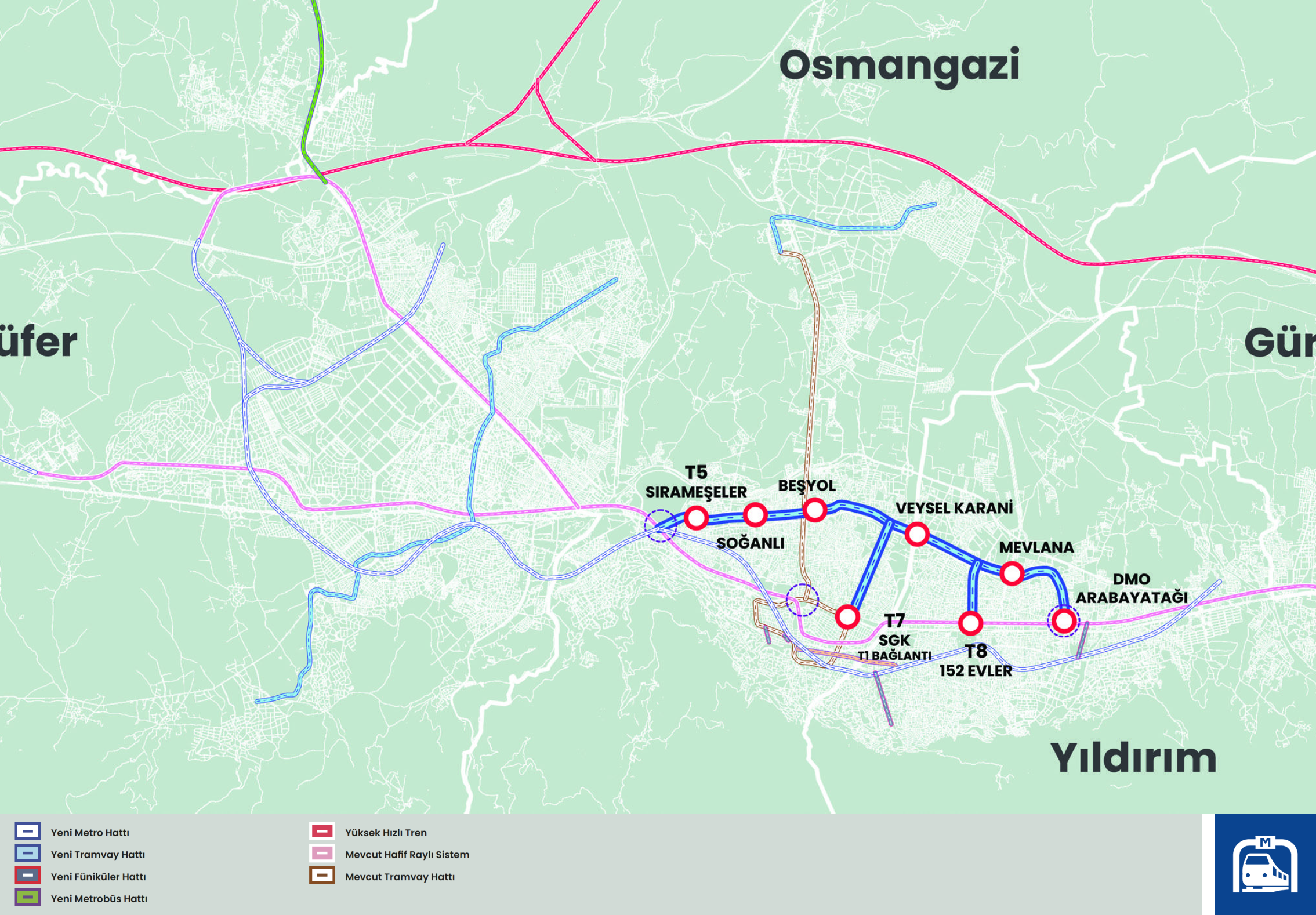 T5 - Sırameşeler, Alemdar, Soğanlı, Kanalboyu, Fatih, Beşyol, Yeşilova, Küçükbalıklı, Veysel Karani, Millet, Yunus Emre, Yıldırım Spor Tesisleri, Mevlana, Ulus, Hacı Hasan Camii, Arabayatağı Depo T7 - Veysel Karani, SGK (T1 bağlantı) T8 - Yunus Emre, 152 Evler