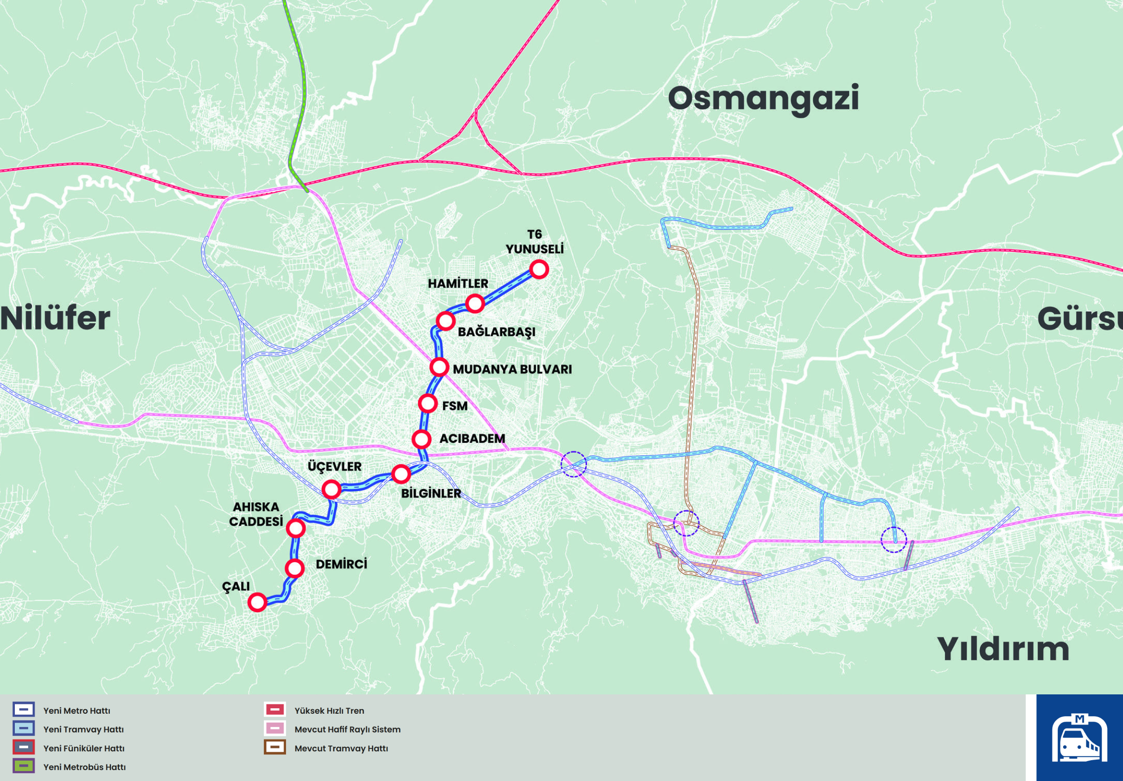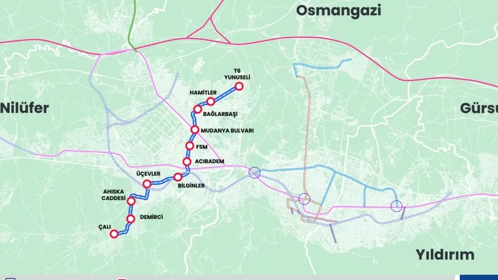 Çalı, Dere, Demirci Caddesi, Ahıska Caddesi, Nilüfer Spor Tesisleri, Denizciler Caddesi, Mahmut Hüdayi Camii, Üçevler, Üçevler Camii, Gümüşdere, Bilginler Caddesi, Karafatma, Acıbadem, FSM, Nilüfer Hatun, Mudanya Bulvarı, Bağlarbaşı, Mesire Alanı, Hamitler, Bulvar, Neşet Ertaş Caddesi, Güneştepe, Yunuseli